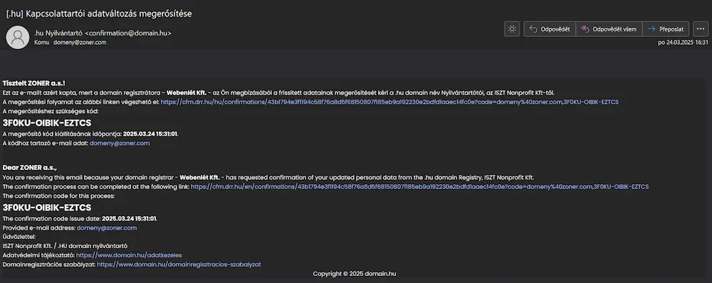 A levél tárgya: “[.hu] Kapcsolati adatok megváltoztatásának megerősítése”, a feladó pedig: “confirmation@domain.hu”.