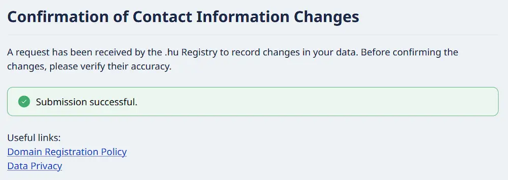 A megerősítés után az ellenőrzés befejeződik, és a kapcsolattartó felhasználható a magyar domainek regisztrációjához.